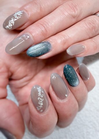 ♪冬映えニュアンスネイル♪ グレーのカラーに、深みのあるブルーのフラッシュマグネットを合わせた上品デザイン♪ さりげないシルバーの箔とストーンが指先にやわらかな華やかさをプラスしてくれます。 オフィスにもお出かけにもおすすめの、この季節ぴったりなデザインです⛄